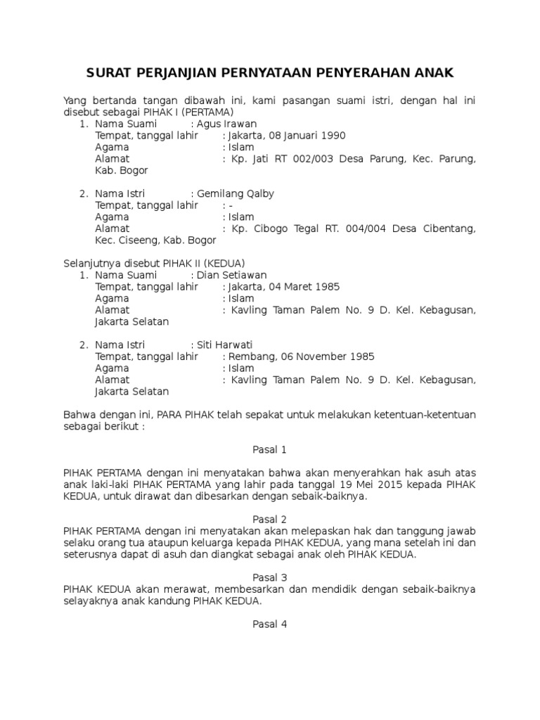 Pembukaan, berisikan kalimat pembuka surat perjanjian. Ingin membuat pernuyataan atau perjanjian dengan pihak lain? Komparisi, bagian ini berisi tentang keterangan perjanjian, seperti siapa saja pihak yang . Bersedia ditempatkan dimana saja di lingkungan universitas negeri . Pemindahan tanggung jawab tersebut akan tertulis di dalam sebuah surat perjanjian pernyataan pertanggungjawaban.